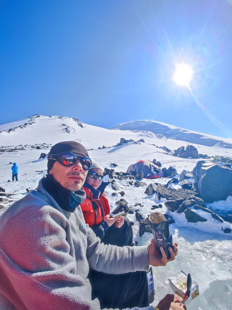 В 1.00 ранний выход на штурм вершины. Будем двигаться двумя группами (связками) – побыстрее и помедленнее. Ориентировочное время выхода на вершину -8.00-9.00. Фотографируемся, отправляем приветы домой и идем в штурмовой лагерь