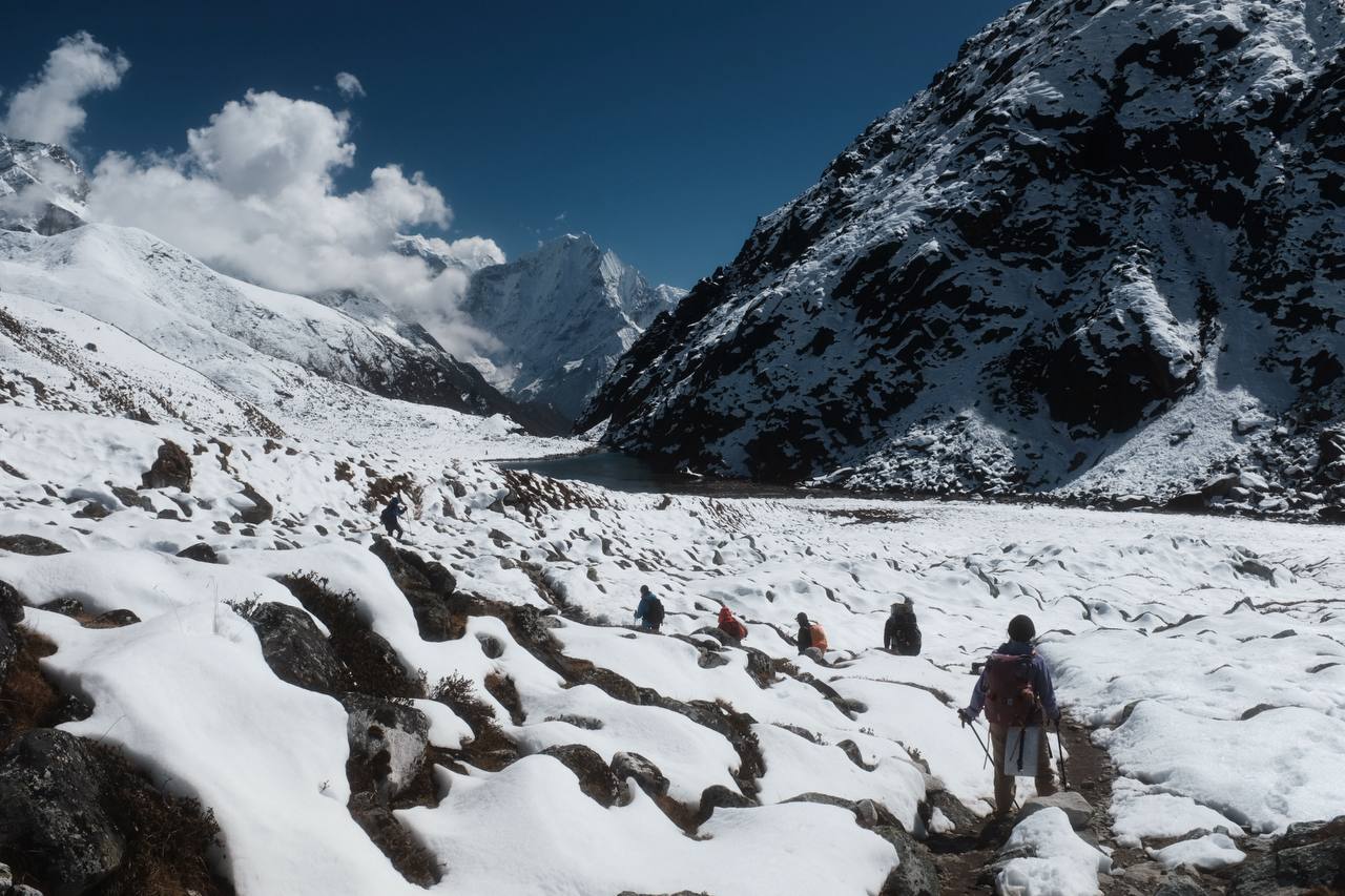 Тропа идет вдоль горной реки, а затем по морене ледника Нгозумпа. Далее приходим в долину в которой развернулись красивейшие высокогорные озера — первое Лонгпонга (4650 м), затем Тауджун (4710 м), и самое большое — озеро Гокио (4750 м), на берегу которого расположен одноименный поселок. Отражение гор в отдающей голубизной воде — это завораживающее зрелище. После обеда либо прогулка вокруг озера, либо подъем на морену с прекрасным видом на самый длинный в Гималаях ледник Нгозумпа.