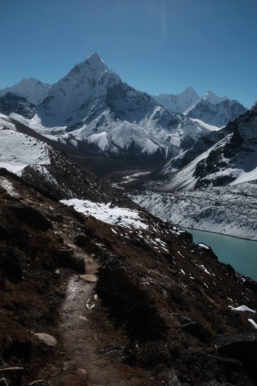 Мы поднимемся вверх к озерам Тонак 4870 м и Нгозумпа 4990 м. Кроме озер отсюда открываются потрясающие виды на вершины Эверест, Чо Ойю, и множество других вершин. Причем, это мое личное мнение, отсюда открывается самый красивый вид на Эверест на этом треке, видно даже седло между Эверестом и Нуптзе через которое поднимаются восходители. После второго озера желающие, те кто в хорошей физической форме, пойдут со мной к третьему озеру Гьязумпа, которое находится на высоте 5200 метров у самого подножия горы Чо Ойю. Остальные спустятся вниз к нашему отелю. Всех на третье озеро я вряд ли смогу взять, так как это еще плюс 10 км к той статистике которая под фото + набор высоты + мы будем ограничены по времени. А нас еще ждут достаточно сложные следующие два дня, нельзя терять много сил.