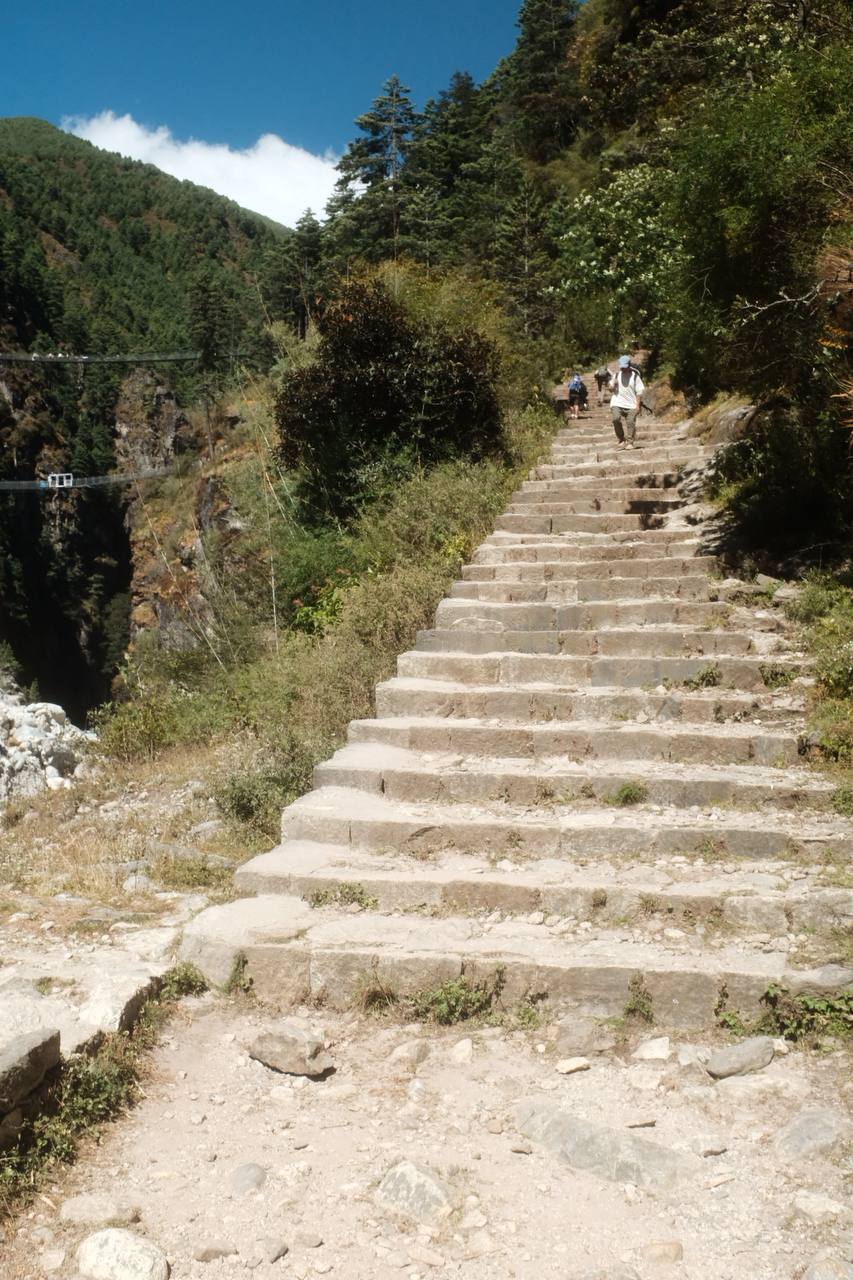 Первая часть пути сегодня будет достаточно пологая с небольшими подъемами и спусками, периодически нам придется пересекать реку Dudh Koshi по многочисленным навесным мостам. А после последнего, самого высокого моста, который носит имя Эдмунда Хилари, начнется крутой и затяжной подъем вверх к Намче Базару, в общем как Вы любите!).